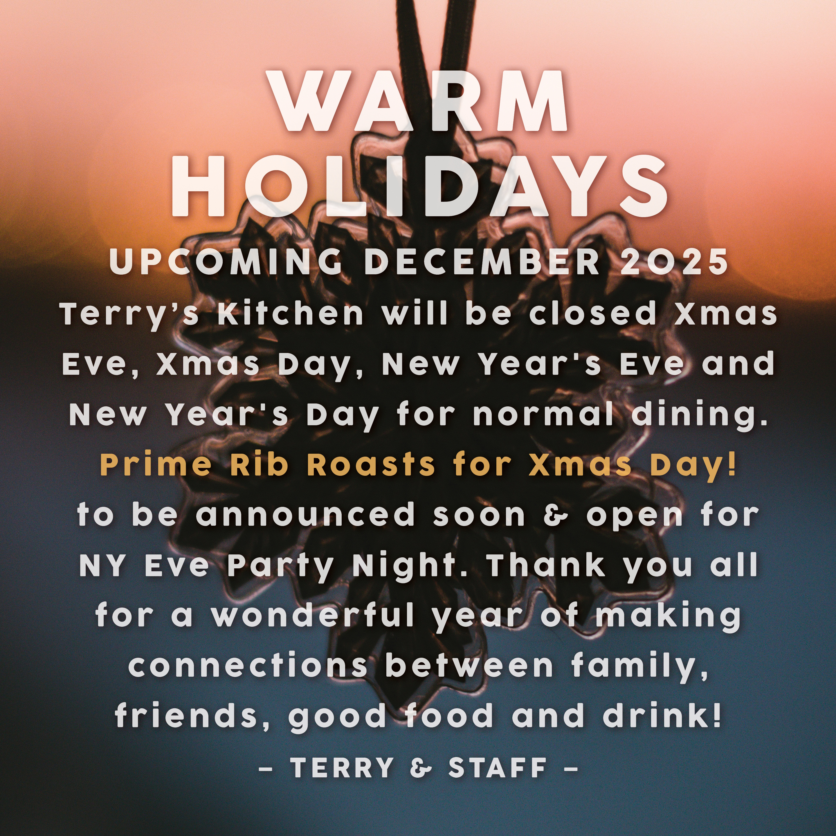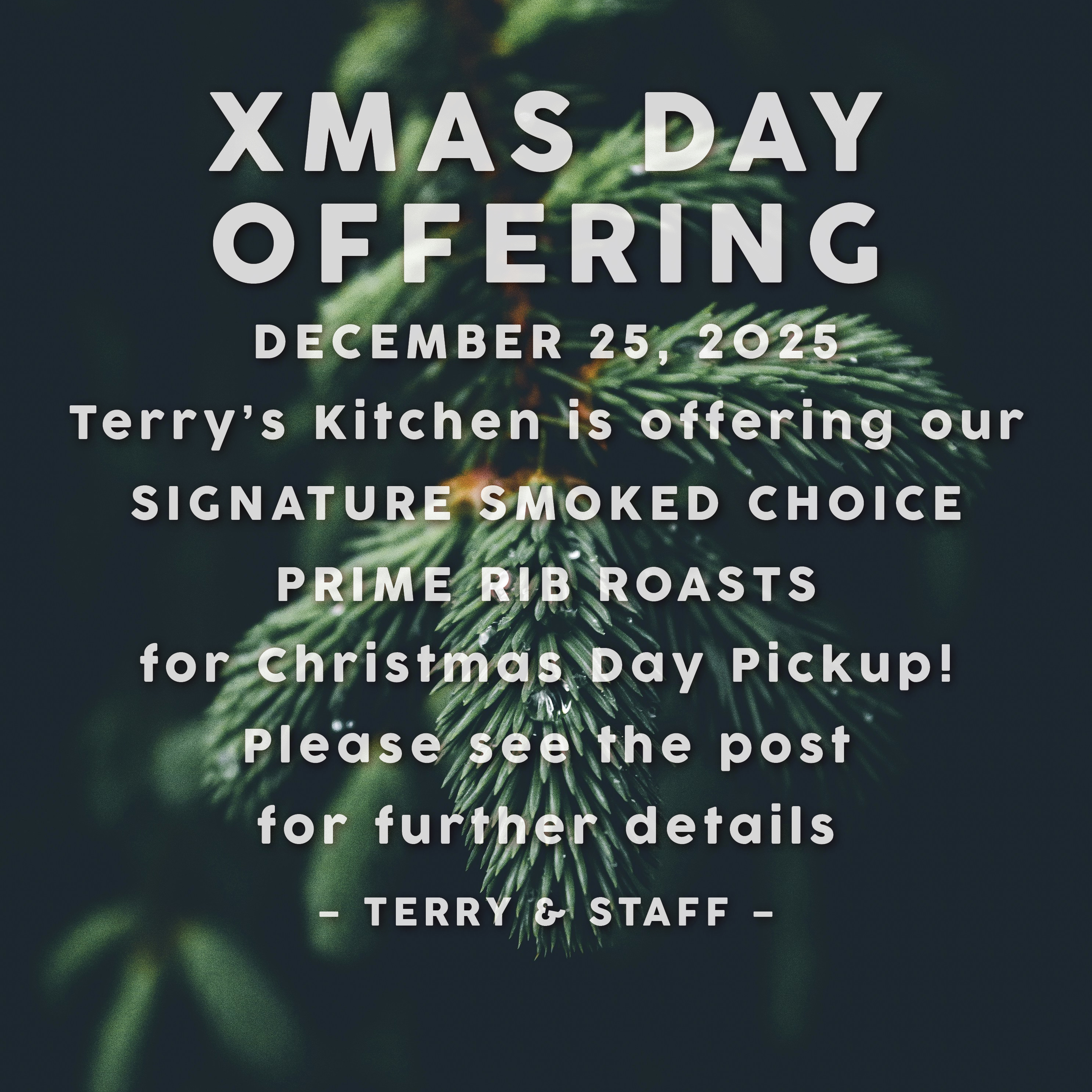 Available Roasts. Cooked to Medium Rare. No additional Sides offered. Just our perfectly Smoked Choice Prime Rib Roast with Au jus. Pickup Time Thursday, December 25th Only Between 2-4 PM. Order early to select your preferred pickup time. Last Day to Place your Order is Sunday, December 21 before 8:30 PM Last Call. 4 lbs (Feeds 6-10 people) ($120) 8 lbs (Feeds 11-15 people) ($240) 12 lbs (Feeds 16-21 people) ($360) 16 lbs (Feeds 22-26 people) ($480) Terry’s Kitchen will be CLOSED for Dinner Service on Christmas Eve and Christmas Day.