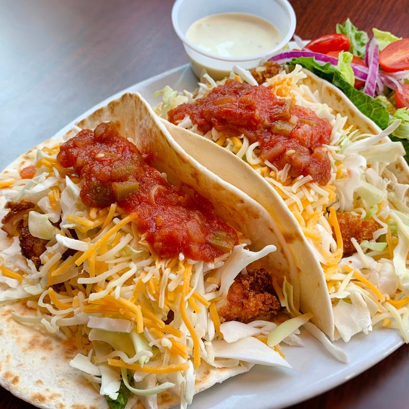 Fish Tacos. Flour Tortillas with Panko Breaded Cod. Served with a Salad. $15.95