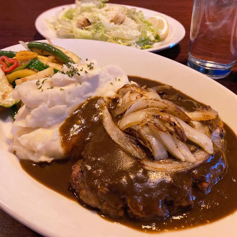 Mom's Angus Hamburger Steak! 3/4lb Ground Angus Beef, Grilled Onions, Gravy & Corn. Choice of Rice or Mashed Potatoes. $15.95